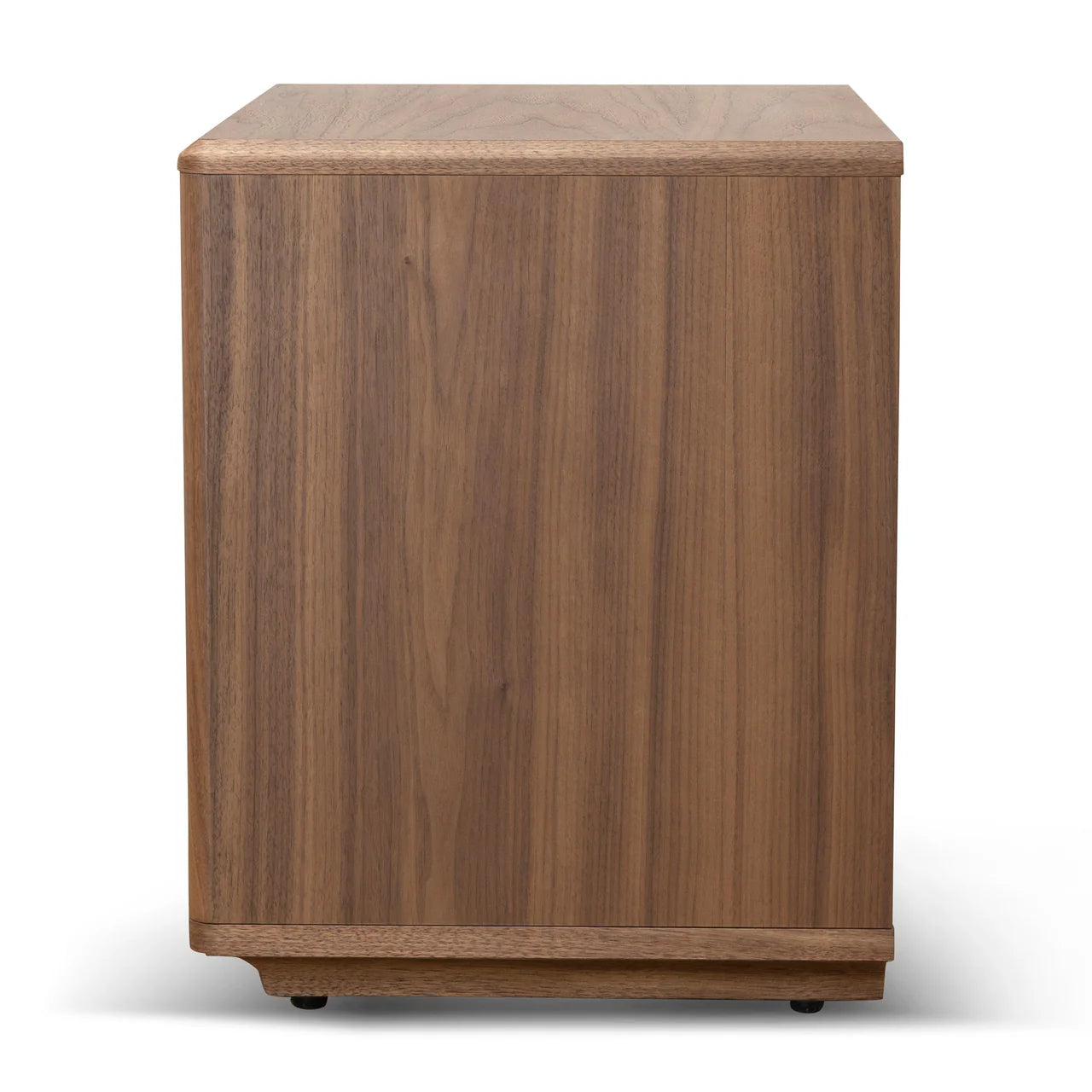 A refined essential for the modern bedroom, this bedside table blends minimalist form with subtle sculptural detailing. Crafted from durable engineered wood and wrapped in a warm walnut veneer, its curved drawer fronts add a gentle softness to the clean, architectural silhouette.